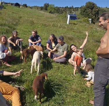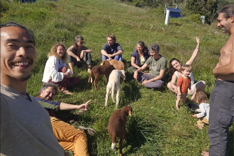 Nous sommes basés dans un écolieu visant l’autonomie et le partage alimentaire et énergétique. Sur place, des animaux, des arbres fruitiers, des plantes aromatiques et medecinales, un potager commun, ..