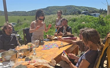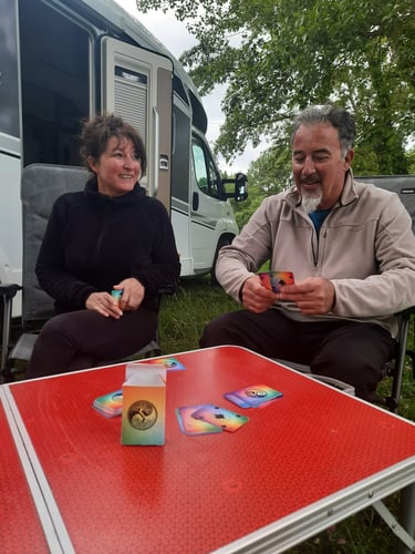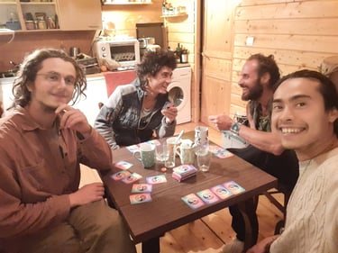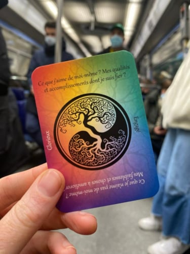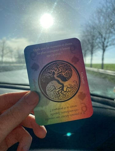 Jouons à un jeu de cartes « classique ». À tout moment — avant, pendant ou après chaque manche — nous pouvons retourner une carte et nous poser ses questions. Par exemple, à chaque tour, chaque joueur peut choisir une carte et partager la ou les questions qu’elle suggère. Les réponses sont libres, honnêtes et créatives. Les règles peuvent évoluer au fil du jeu pour s’adapter à l’énergie individuelle ou collective.